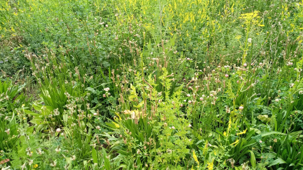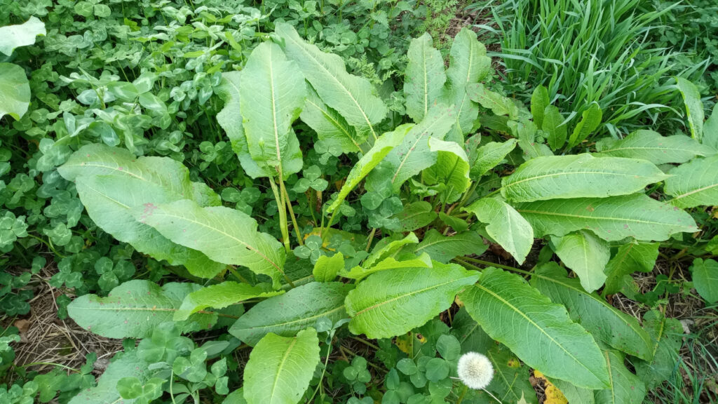 Hier sehen wir Ampfer. Dieser unterdrückt mit seinen breiten und verdunkelnden Blättern die Pflanzen um sich herum und bildet ebenfalls viele Samen, welche bis zu 50 Jahre lang im Boden keimfähig bleiben können