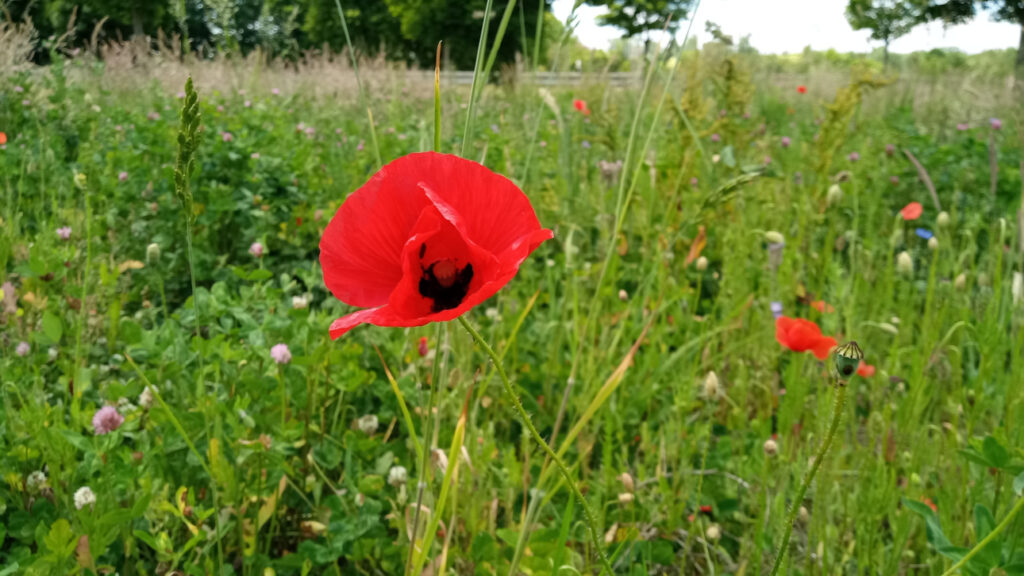 Auch hier hat sich ein Insekt beim Pollen sammeln in der Mohnblüte versteckt. Ebenfalls sieht man den Glockenförmigen Samenstand des Mohns, welcher uns die nächsten Jahre noch öfter Probleme bereiten wird