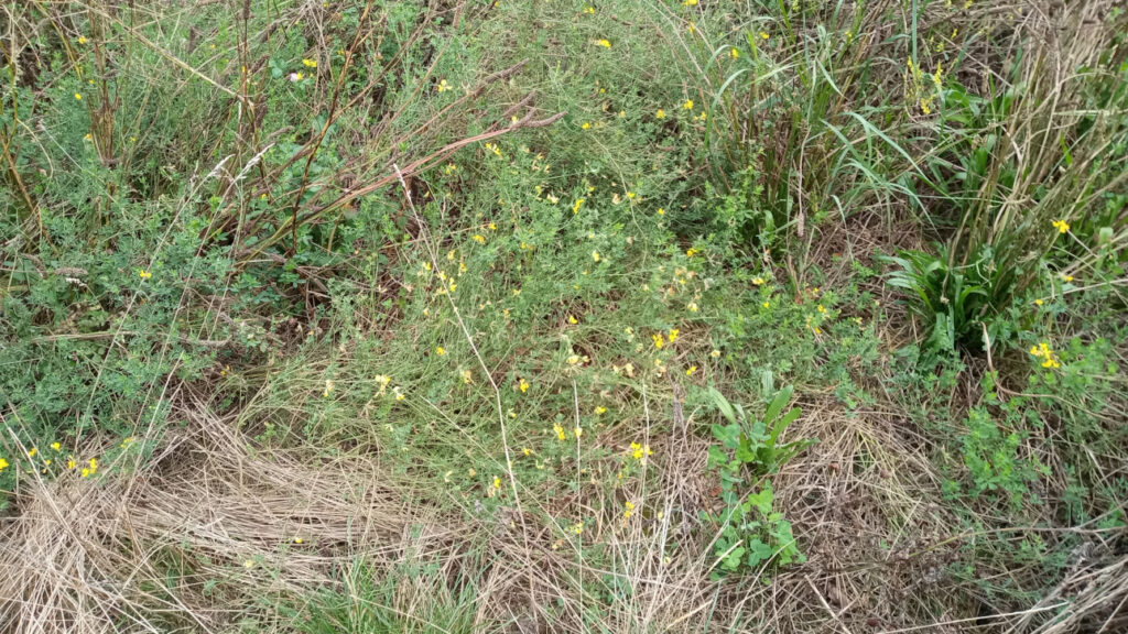 Hier sehen wir abgeblühten Steinklee, bei dem jetzt die Unterkräuter anfangen zu blühen. Hier ist auch eine Malve mit ihrer lila Blüte zu sehen, welche in der Lage ist viele Samen und dicke Stängel zu bilden und somit auch in folgenden Jahren wieder zu erscheinen.